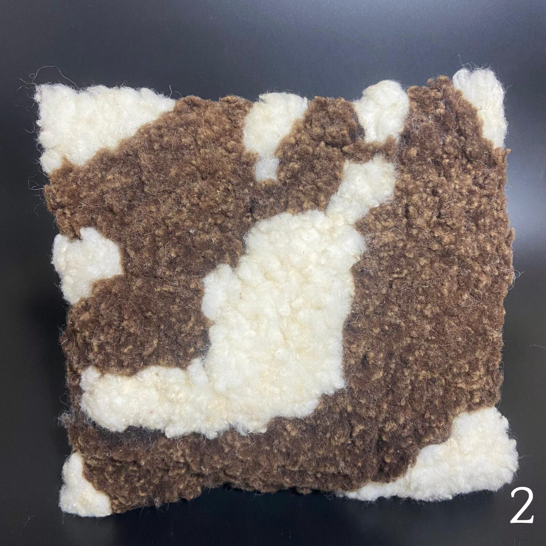 A parte da frente é feita de mechas de lã de ovelha feltradas sobre um forro de lã compacta. O verso é feito de feltro de lã branca simples. A parte da frente e a parte de trás da almofada são costuradas à mão com um fio grosso de algodão castanho. As almofadas são preenchidas com pequenas esferas de lã.