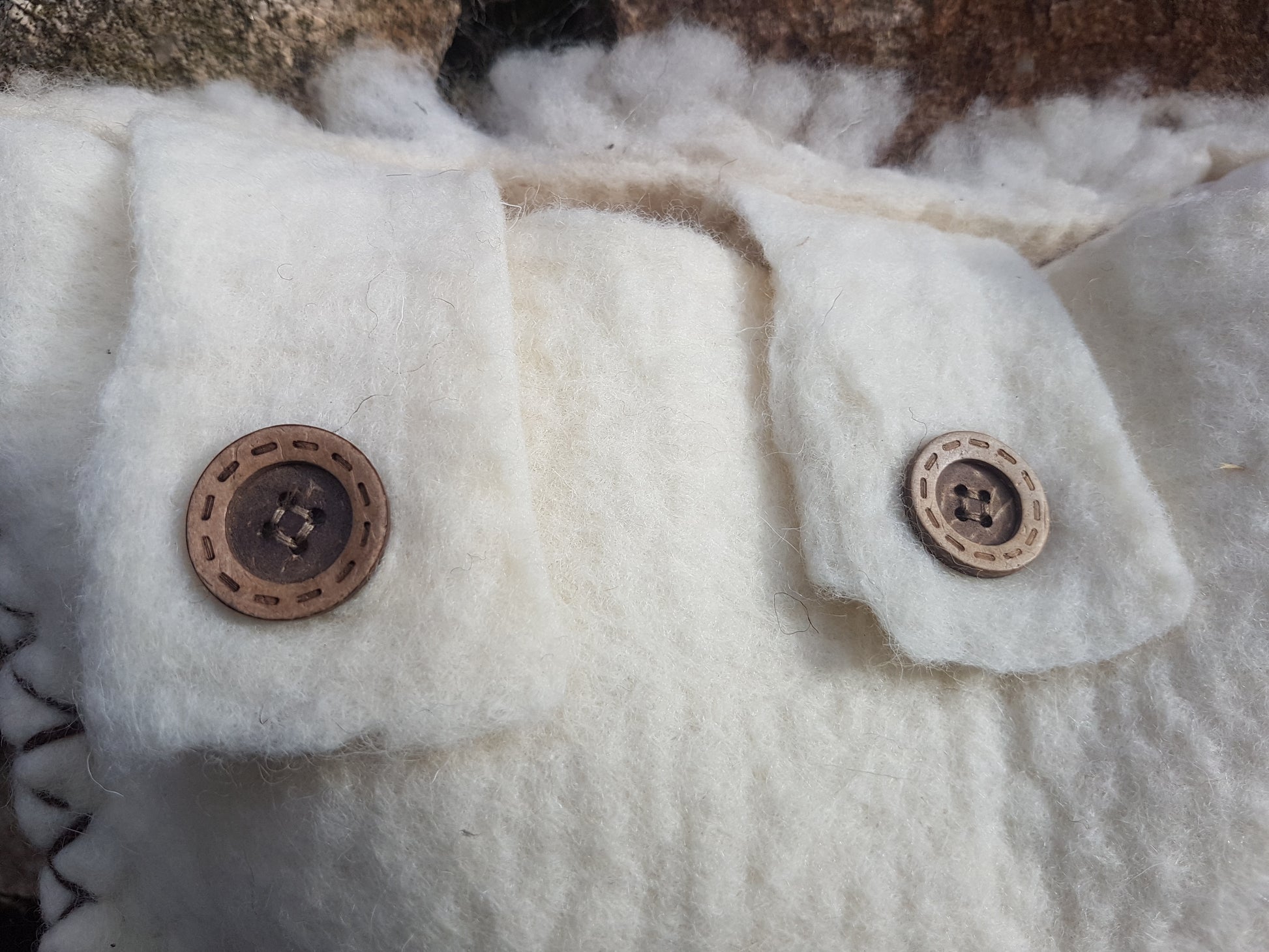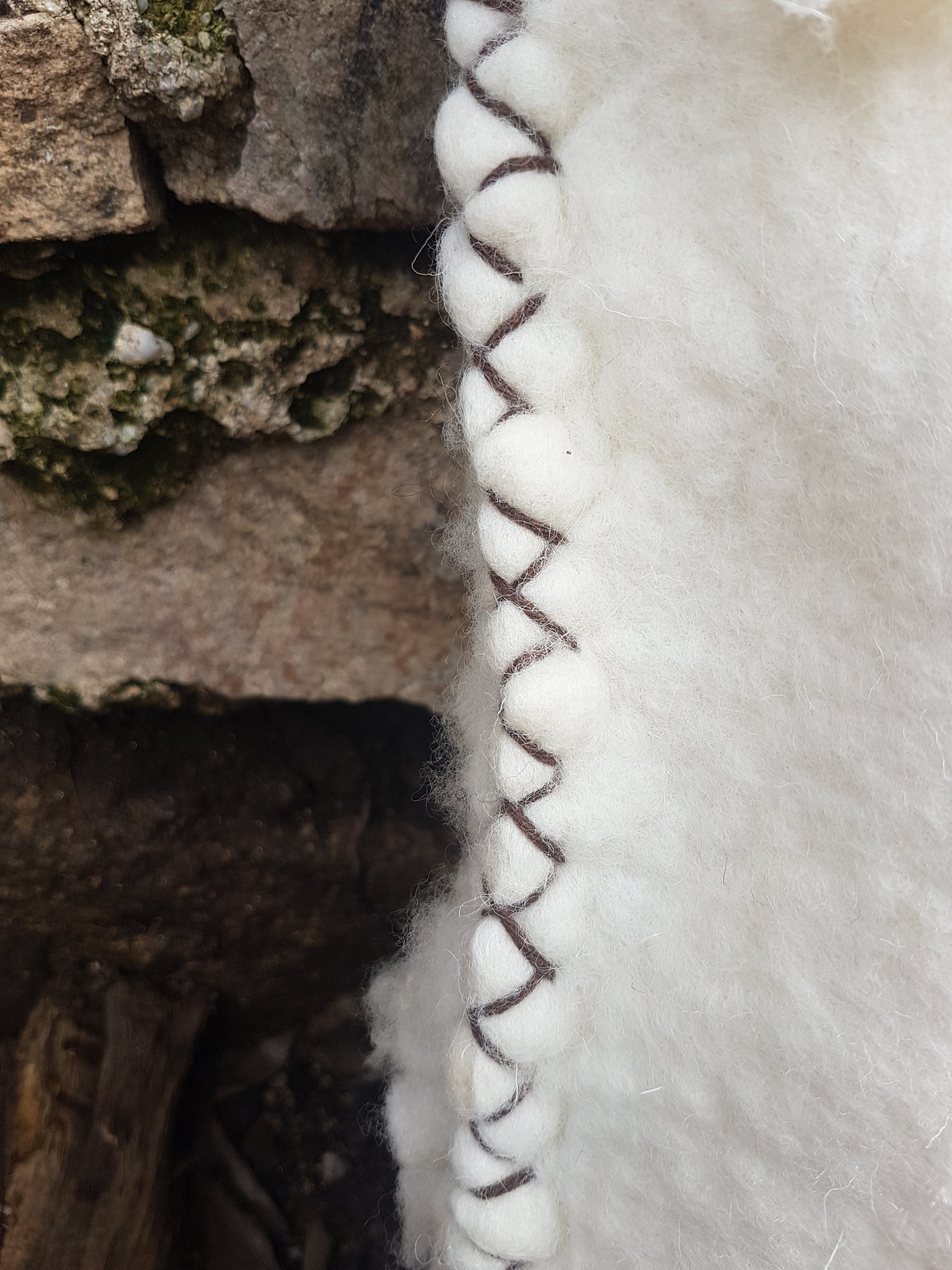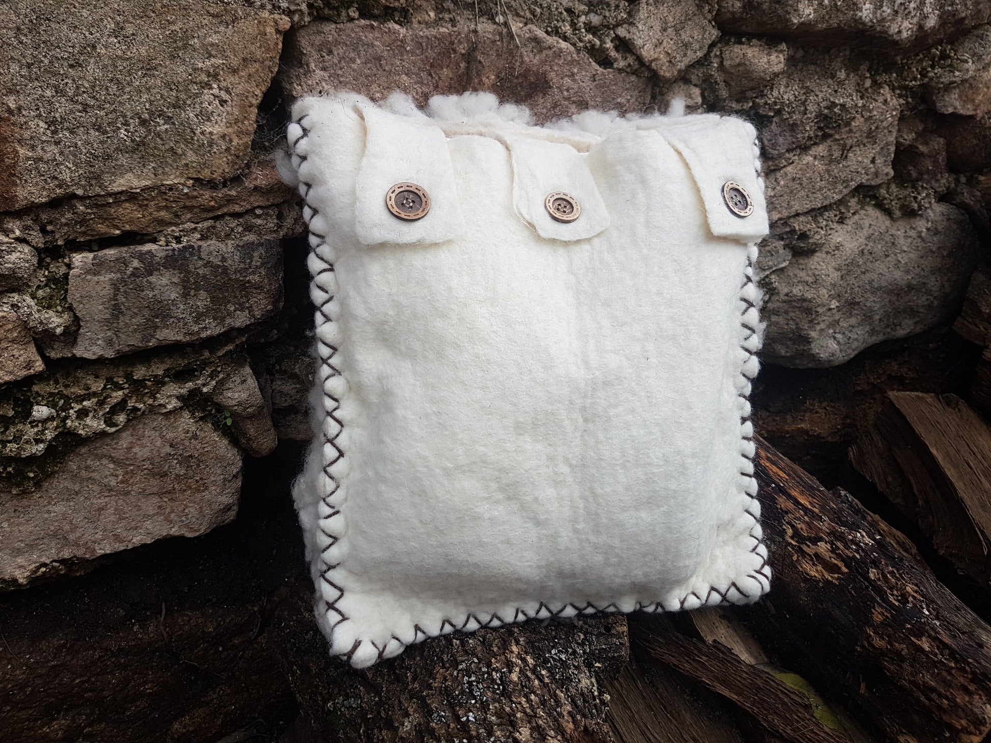 A frente é feita de mechas de lã de ovelha branca feltradas sobre um forro de lã compacta. O verso é feito de feltro de lã branca simples. A frente e o verso das capas das almofadas são costurados à mão com linha grossa de algodão castanho. Os botões de madeira permitem que a capa da almofada seja aberta.