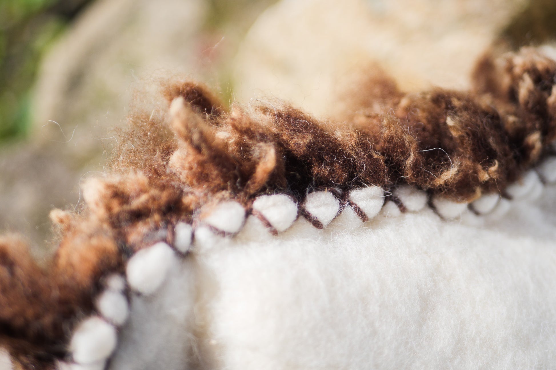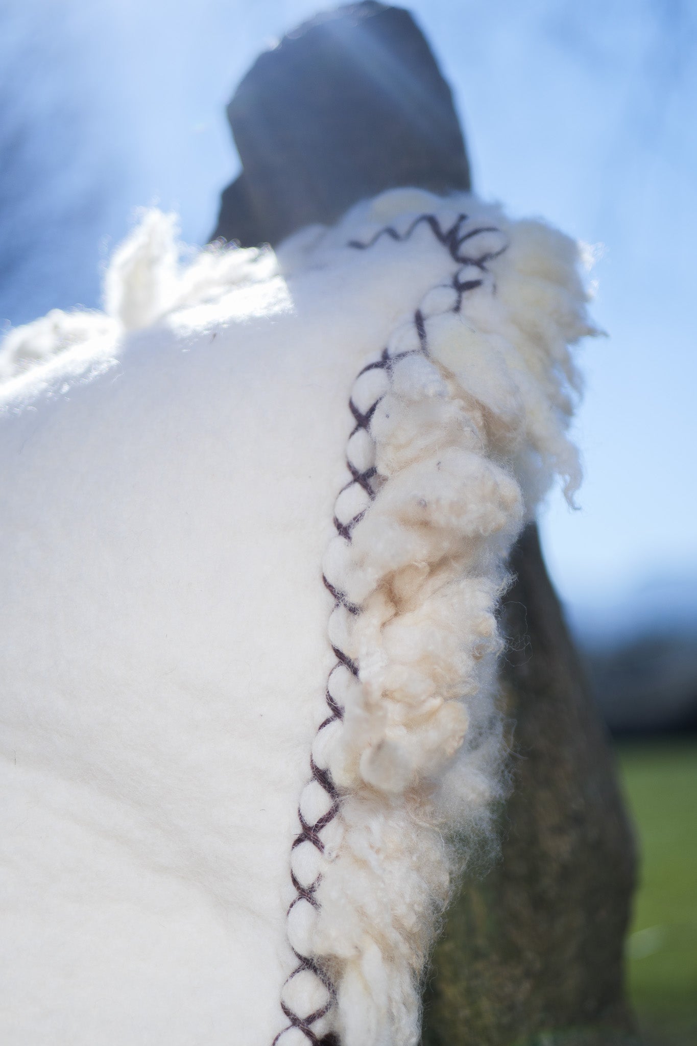 Esta almofada de feltro branca e fofa é feita à mão com 100% lã merina branca e castanha proveniente de agricultores locais.
