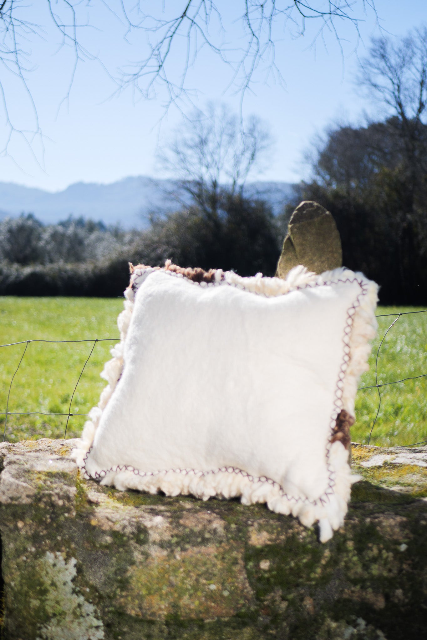 Estas almofadas são 100% feitas à mão. Os fios de lã são provenientes de ovelhas que estão ao ar livre durante todo o ano e, como tal, podem conter matéria vegetal, como paus e sementes, mesmo que removamos o máximo de objetos possível durante a produção.